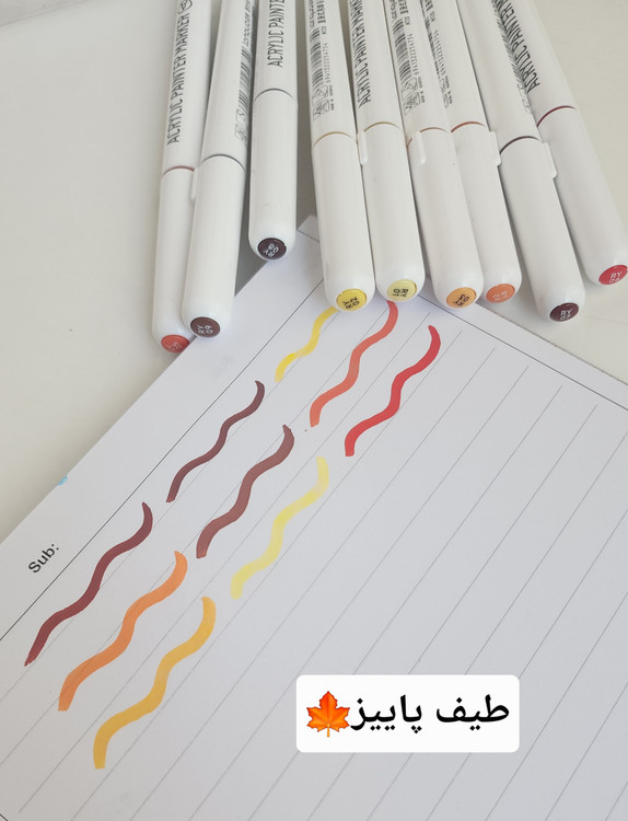 ویژگی ها: مارکر اکریلیک: برای نقاشی و تزیین روی کاغذ، مقوا، بوم و بیشتر سطوح مثل چوب، شیشه و فلز. مناسب جزئیات، هایلایت و پروژههای هنری و کاردستی. خشکشون سریع و پوشششون مات و یکنواخته.