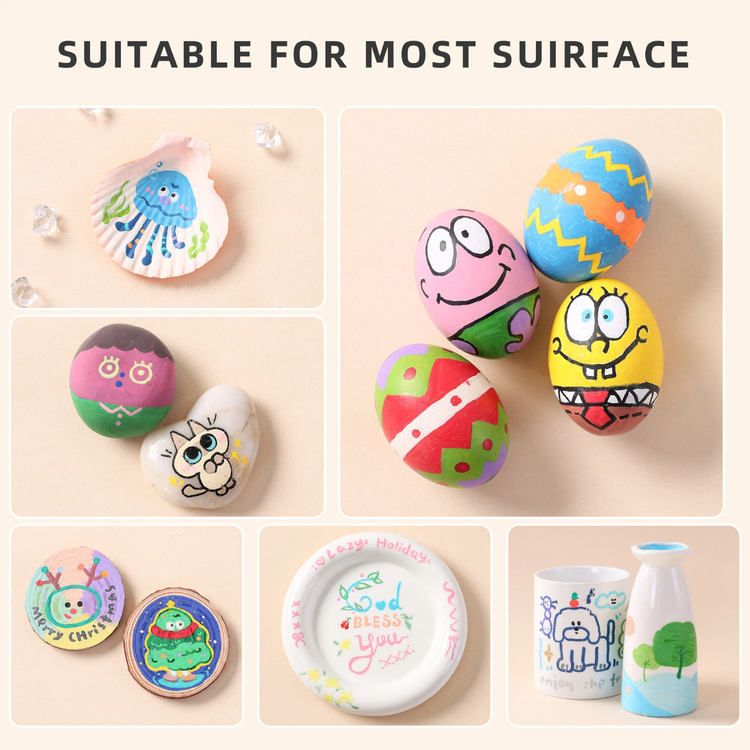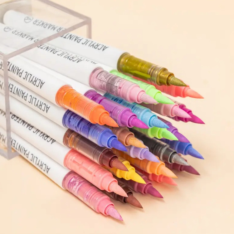 مارکر اکریلیک: برای نقاشی و تزیین روی کاغذ، مقوا، بوم و بیشتر سطوح مثل چوب، شیشه و فلز. مناسب جزئیات، هایلایت و پروژههای هنری و کاردستی. خشکشون سریع و پوشششون مات و یکنواخته.